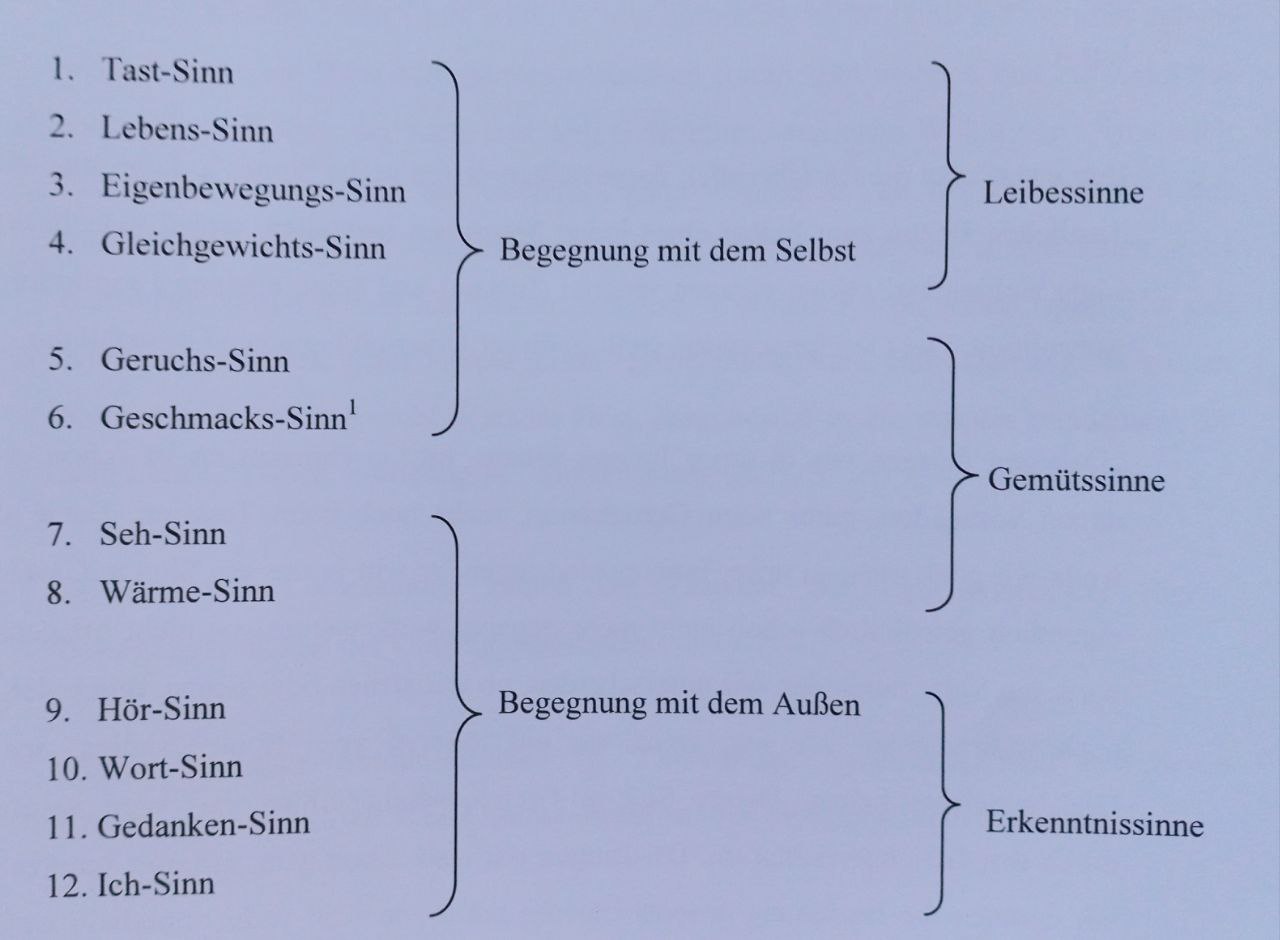 Rudolf Steiner beschreibt insgesamt zwölf verschiedene Sinnesleistungen des Menschen, deren Ausbildung, Weiterentwicklung und Pflege schon von Geburt an eine wichtige Rolle spielt. Dr. Michaela Glöckler, Kinderärztin und Leiterin der Medizinischen Sektion am Goetheanum in Dornach / Schweiz beschreibt die Wichtigkeit der Sinnespflege als Grundlage zur Entwicklung nicht nur körperlicher, sondern auch seelischer und geistiger Kompetenzen. Nicht nur Selbsterfahrung und Selbstbewusstsein, auch verschiedene Intelligenzleistungen bauen auf einer gut eingespielten Sinnestätigkeit auf, da das Kind, vor allem in seiner frühkindlichen Entwicklung als ganzes, sozusagen sein ganzer Leib auf Anregungen oder Vorbilder reagiert.